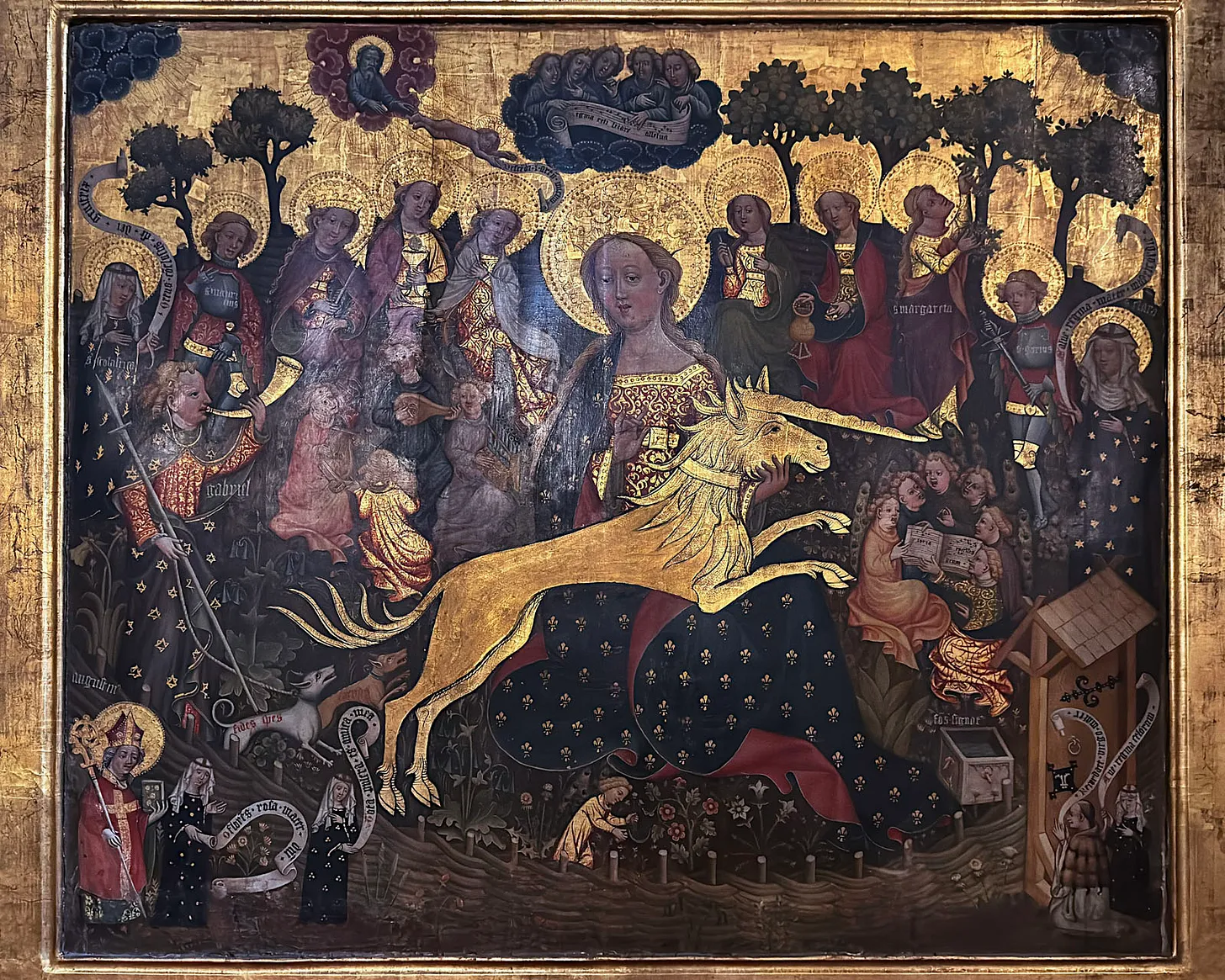 Another thing I found out about over the summer was how the image of the unicorn was used over the ages to represent Christ. In particular how images of a unicorn laying his head in the lap of a virgin, was used to depict the Annunciation. The Annunciation is very special to me, so I clicked with that imagery. There are also images of a unicorn being stuck with a spear and his blood pouring into a chalice that represent the crucifixion and of course, the Eucharist.